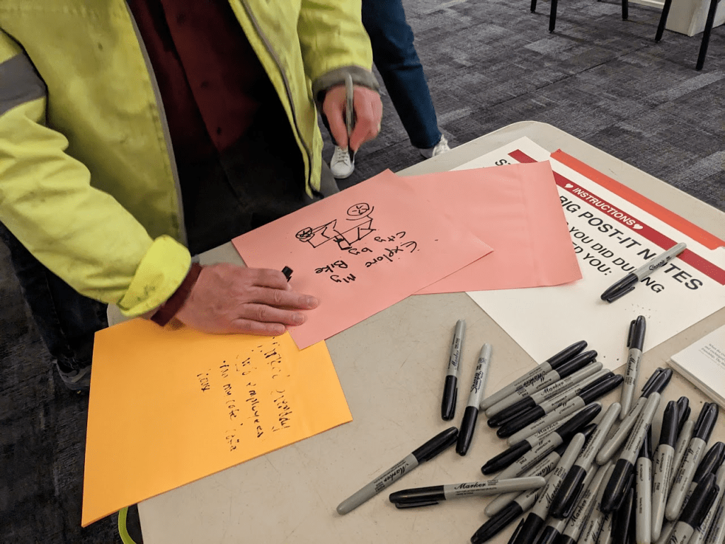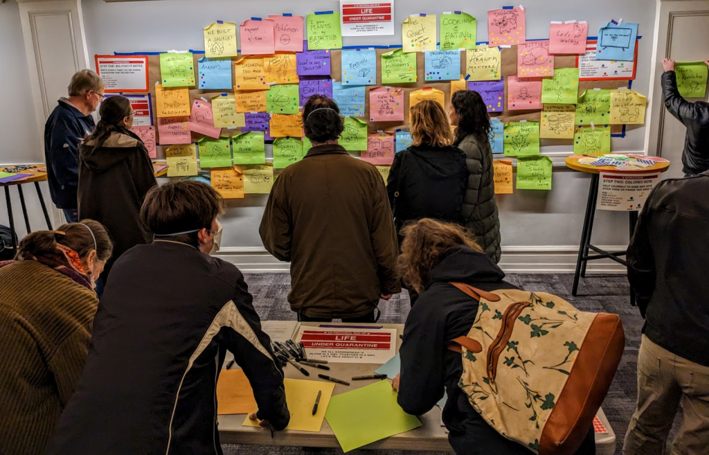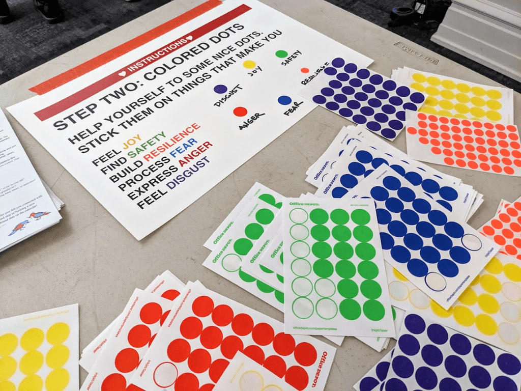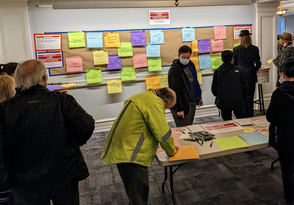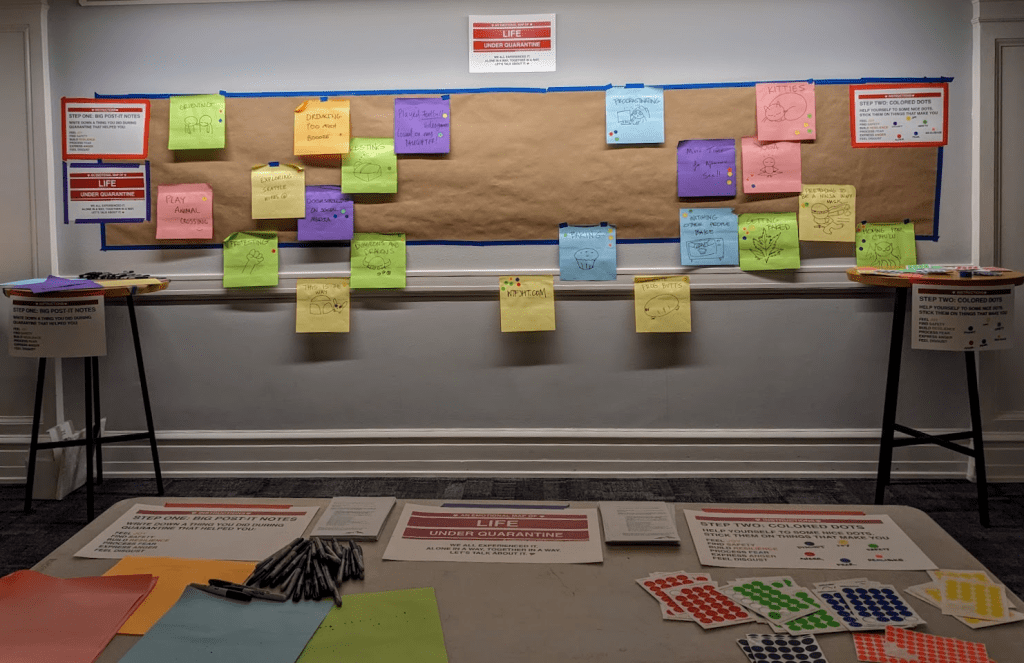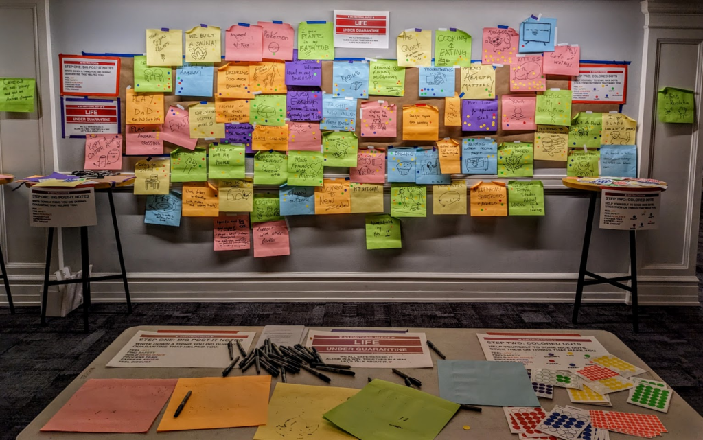 For Ignite #43’s pre-show event my colleagues and I gave everyone very large Post-it notes and Sharpie markers and asked them to write, draw, cartoon, or otherwise explain something they did during quarantine. We also gave everyone stickers with six different colors representing different emotions. We asked everyone to place stickers on any Post-it describing something that helped them to feel joy (yellow), feel safety (green), build resilience (orange), process fear (blue), express anger (red), or express disgust (purple). I didn’t choose these colors or emotions at random, they’re derived from emotional base-pairs hardwired into our brains through evolution–meaning they express elemental survival imperatives (the subject of my long-awaited PhD dissertation).