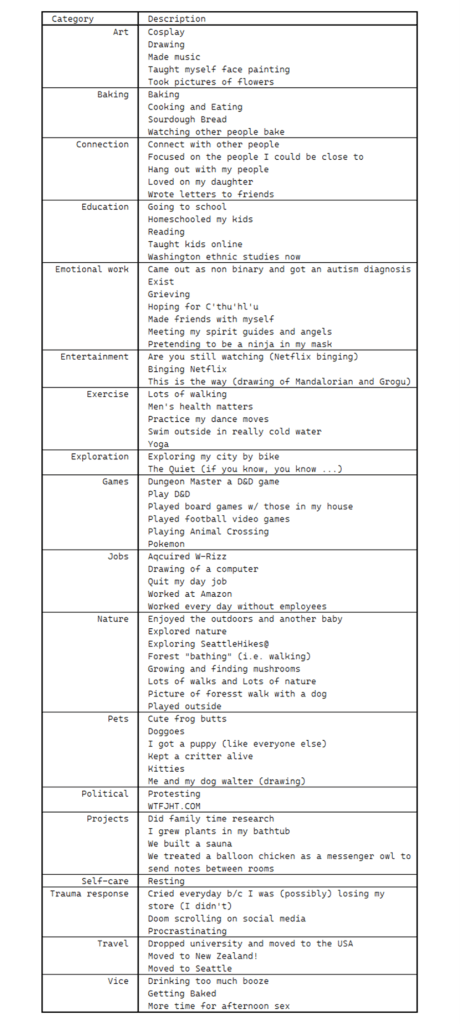 As I look at this chart, what I find the most interesting is that binging Netflix, reading, resting, doom scrolling, and playing with my cats are all things I did every day during the pandemic. I also experienced them much the same way others did, as a way to build joy, safety, resilience, and process my fear. For me, it’s a little bit of evidence to suggest that I’m not so different from the people I see on the street. I also recognize that I’ve beaten myself up pretty mercilessly for doing things like resting, procrastinating, and binging Netflix–when in fact I’m far from the only person who survived that way. In a way, I feel like this chart gives me permission to feel good about what I did to get by in quarantine. After all, I’m just doing what other people in Seattle did, and more broadly, I’m doing the types of things that help a human being survive frightening and uncertain times.